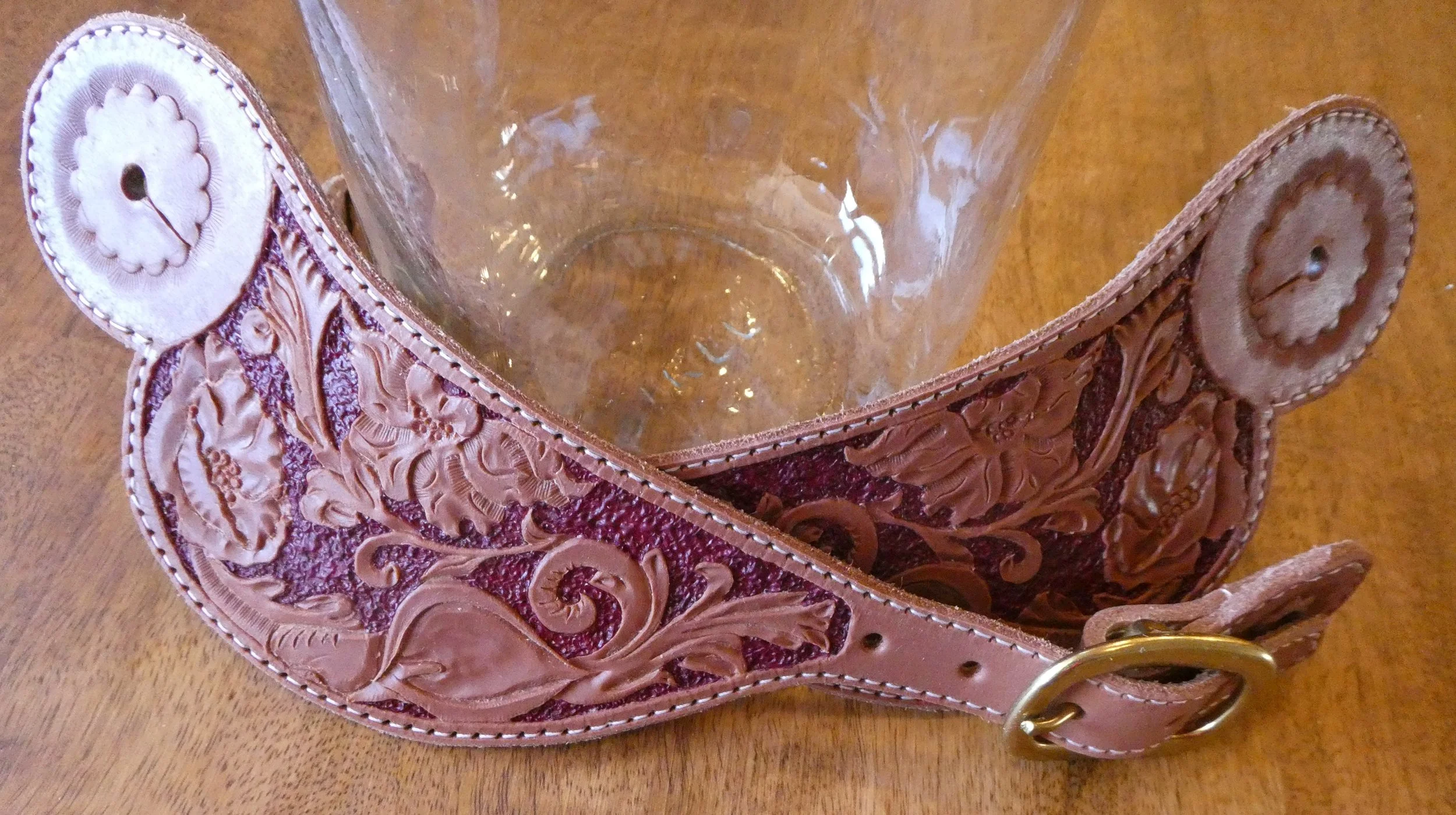 Tooled wild rose, poppy, and calla lilly pattern, scalloped ends, stippled and stained red background, stitched edges, and brass buckles.
